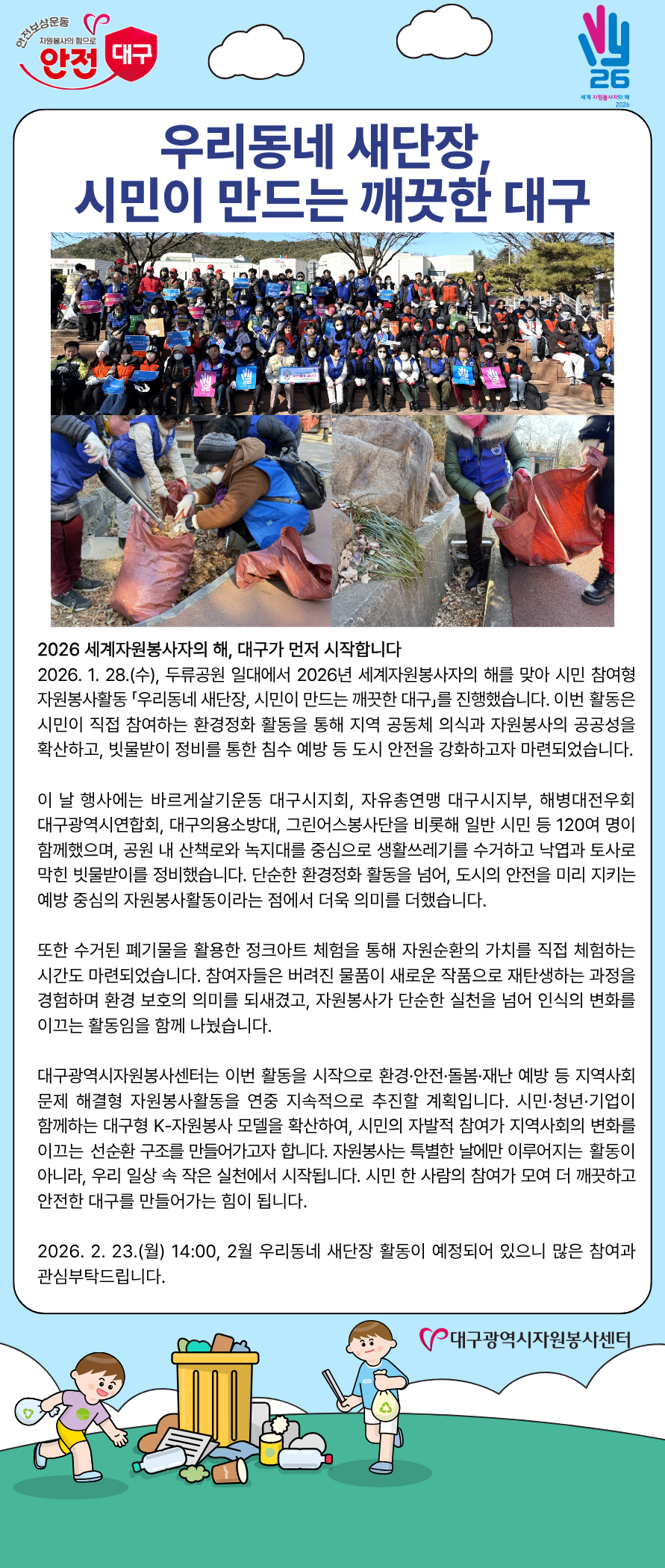 | Á¦ ¸ñ | [26-02È£] ¿ì¸®µ¿³× »õ´ÜÀå, ½Ã¹ÎÀÌ ¸¸µå´Â ±ú²ýÇÑ ´ë±¸ | ||