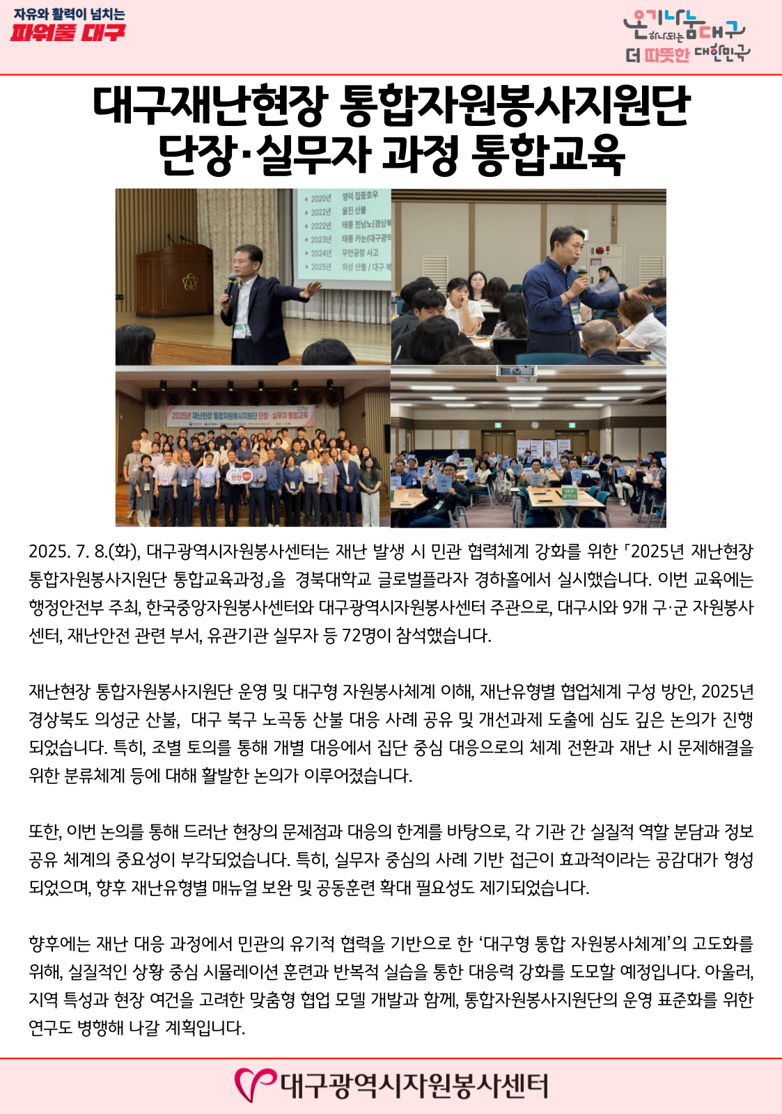 | Á¦ ¸ñ | [25-17È£] ´ë±¸Àç³ÇöÀå ÅëÇÕÀÚ¿øºÀ»çÁö¿ø´Ü ´ÜÀ塤½Ç¹«ÀÚ °úÁ¤ ÅëÇÕ±³À° | ||