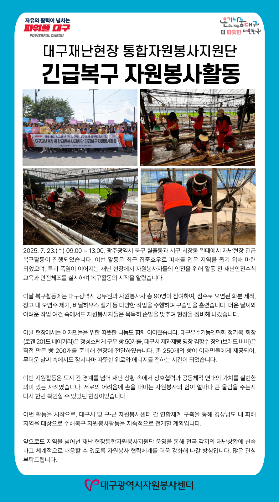| Á¦ ¸ñ | [25-18È£] ´ë±¸Àç³ÇöÀå ÅëÇÕÀÚ¿øºÀ»çÁö¿ø´Ü ±ä±Þº¹±¸ ÀÚ¿øºÀ»çȰµ¿ | ||